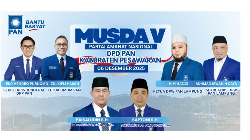 Partai Amanat Nasional (PAN) Kabupaten Pesawaran akan menggelar Musyawarah Daerah (Musda) ke-5 yang dijadwalkan berlangsung pada hari Sabtu, tanggal 6 Desember 2025. Acara penting ini akan diselenggarakan di sekretariat DPD PAN Kabupaten Pesawaran yang berlokasi di Jalan Raya Kedondong, Kecamatan Gedongtataan, Kabupaten Pesawaran.