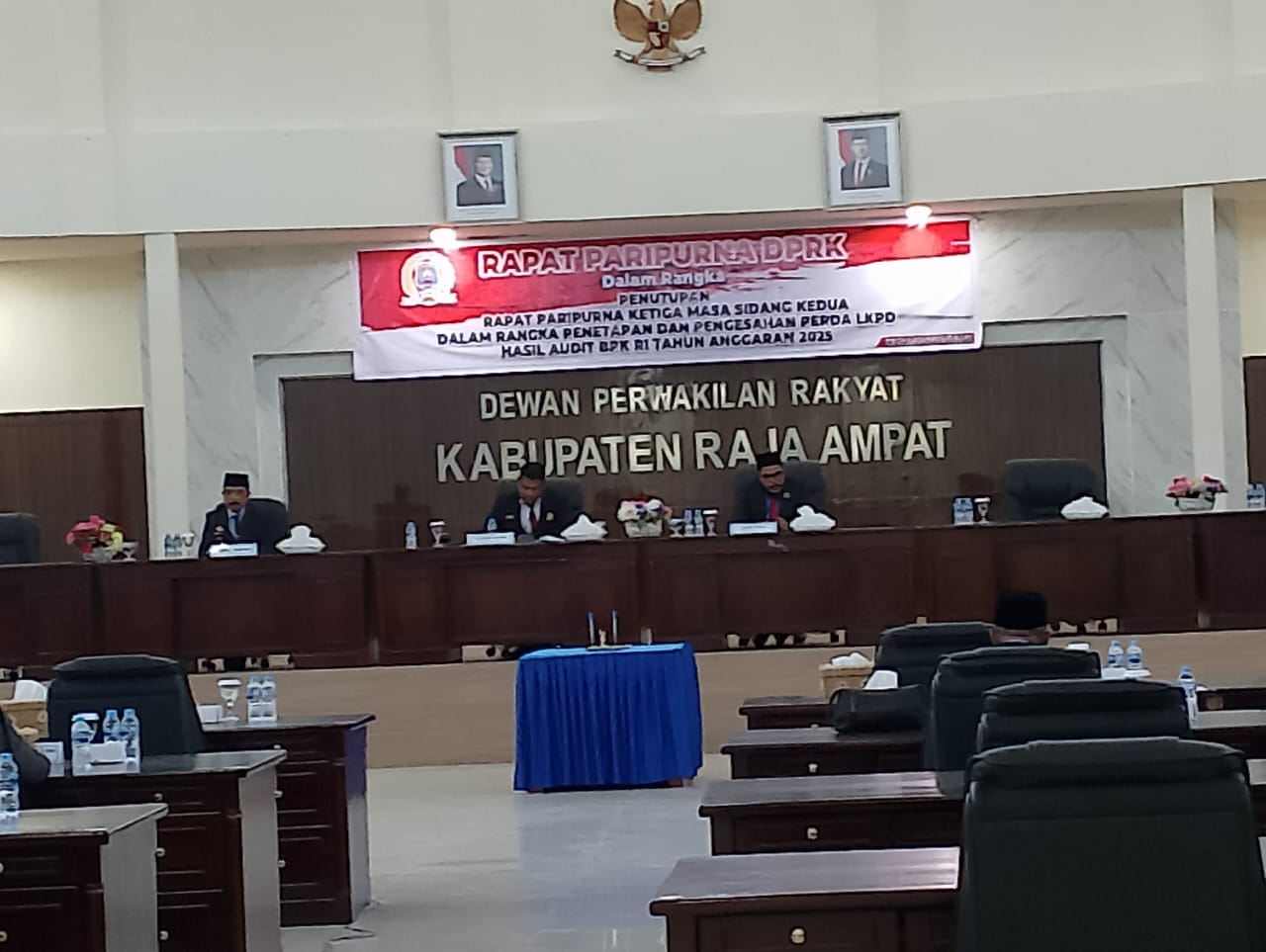 Wakil Bupati Raja Ampat, Drs. Mansyur Syahdan, M.Si menghadiri acara Penutupan Rapat Paripurna Ketiga Masa Sidang Kedua dalam rangka Penetapan LKPD Hasil Audit BPK RI Tahun Anggaran 2024, yang digelar di Ruang Sidang DPRK Raja Ampat, Jumat (29/08/2025).