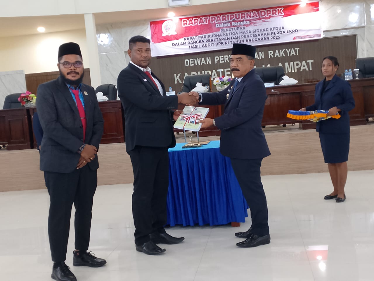 Dengan disahkannya Perda LKPD hasil audit BPK RI Tahun Anggaran 2024 ini, kami berharap dapat menjadi dasar yang kuat bagi kita untuk terus meningkatkan kualitas pengelolaan keuangan daerah. Mari kita jadikan momentum untuk menuju “Raja Ampat Bangkit”, maju, sejahtera, dan berkelanjutan.
